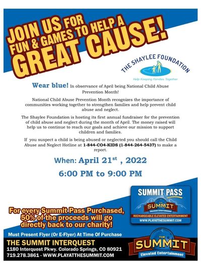 Please mark your calendars for a family night out in observance of April being Child Abuse Prevention and Awareness Month. Join the Shaylee Foundation as we will be hosting two separate fundraising events in Colorado Springs on April 21st and In Thorthon Colorado on April 28th.